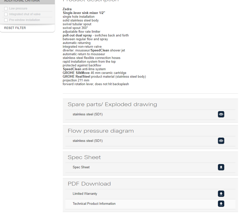 Select the name, and follow the link to the Grohe global website where you can view dimensional drawings, spare parts information, TPI (Technical Product Information/installation instructions) and the product description. See Step 4!
